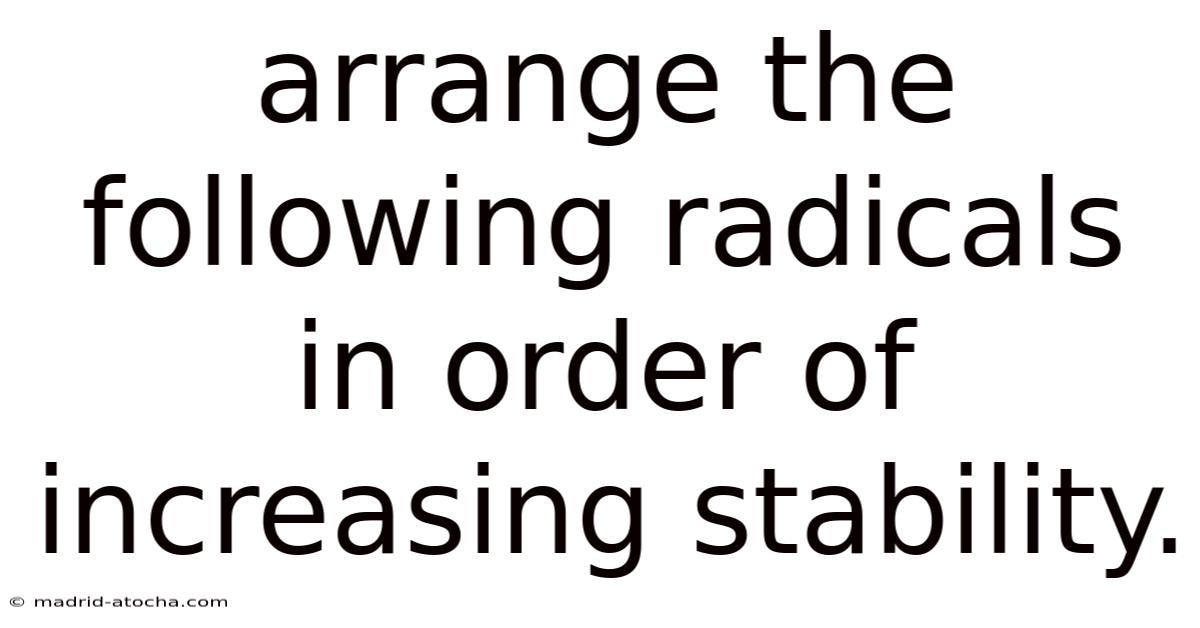 Radicals, atoms or molecules with unpaired electrons, are inherently reactive due to their tendency to seek stability. Worth adding: understanding the relative stability of different radicals is crucial in fields like organic chemistry, polymer science, and biochemistry. Consider this: the stability of a radical is influenced by several factors, including the number of adjacent atoms, hybridization, resonance effects, and the nature of the atom bearing the unpaired electron. This article explores how to arrange radicals in order of increasing stability by analyzing these key factors.