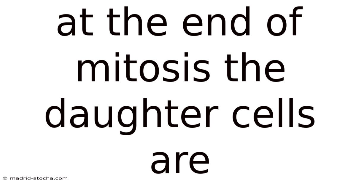 At the end of mitosis, the daughter cells are genetically identical to each other and to the original parent cell. This is one of the most critical outcomes of mitosis and distinguishes it from meiosis, which produces genetically diverse cells. Each daughter cell receives an exact copy of each chromosome that was present in the parent cell, ensuring that the genetic information is preserved across cell generations.