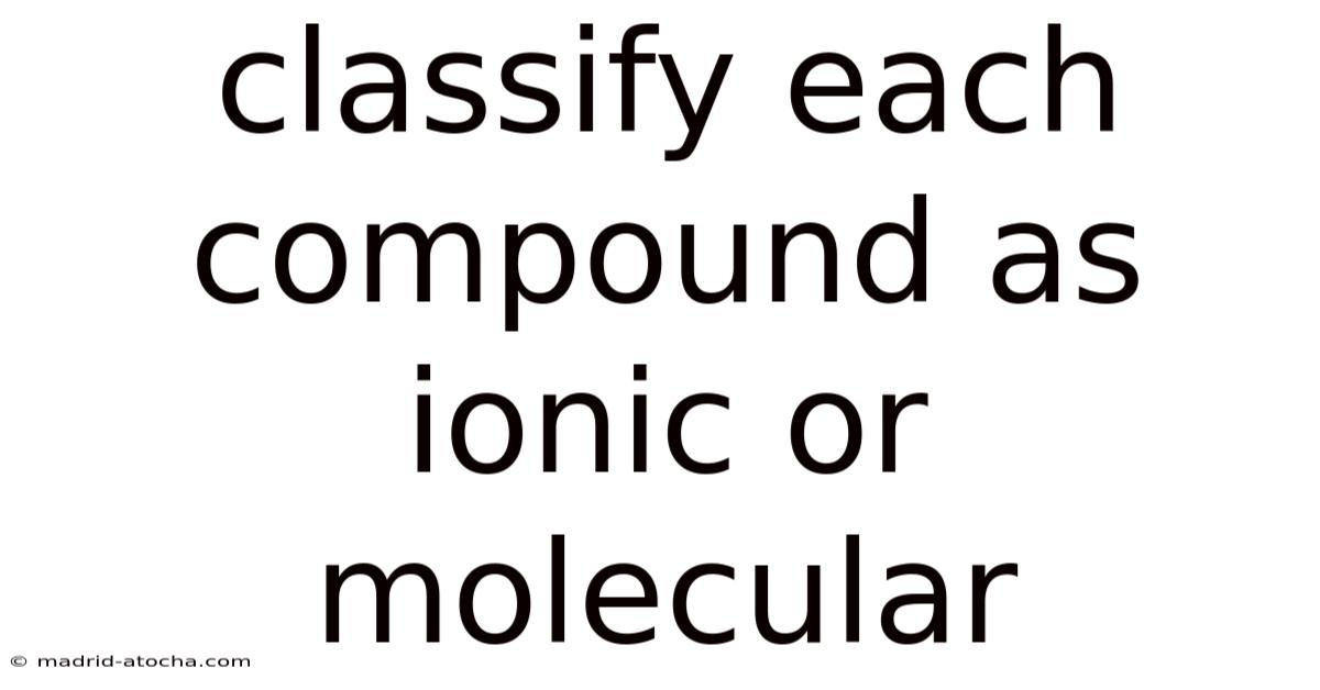 Learning how to classify each compound as ionic or molecular is a foundational chemistry skill that transforms confusing chemical formulas into clear, predictable patterns. Which means whether you are preparing for a high school exam, navigating introductory college coursework, or simply exploring the science behind everyday materials, recognizing the difference between these two bonding categories will sharpen your analytical thinking and deepen your understanding of matter. This guide provides a straightforward, step-by-step framework, explains the atomic principles that drive chemical bonding, and equips you with practical strategies to confidently identify ionic and molecular compounds without relying on rote memorization Most people skip this — try not to..