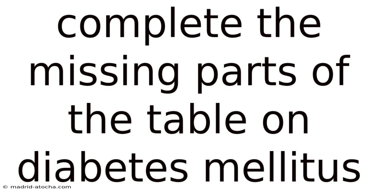 Diabetes mellitus is a chronic metabolic disorder characterized by elevated blood glucose levels due to insulin deficiency or resistance. Managing this condition effectively requires a thorough understanding of its types, symptoms, diagnostic criteria, and treatment options. And a well-structured table summarizing key aspects of diabetes mellitus can serve as a valuable reference for patients, healthcare providers, and educators. Even so, many such tables often have missing or incomplete information, which can lead to confusion or misinterpretation. This article aims to guide you through the process of filling in the missing parts of a diabetes mellitus table, ensuring accuracy, clarity, and relevance.