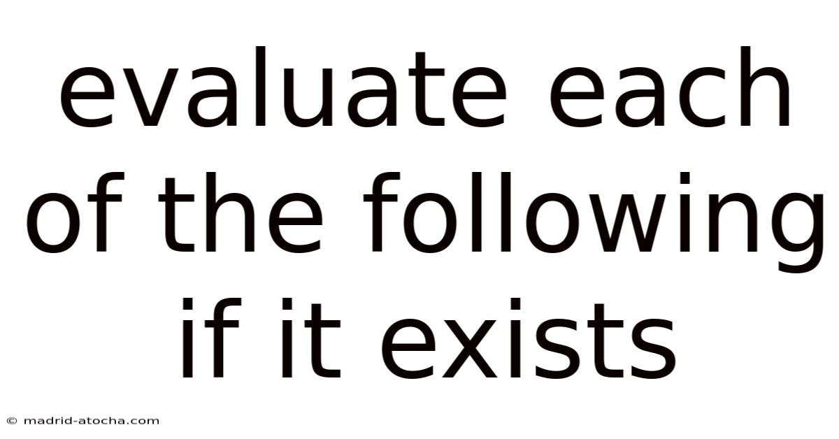 When a problem asks you to evaluate each of the following if it exists, it is essentially testing two skills at once: the ability to compute a value and the ability to recognize whether that value is even defined. So in mathematics, many expressions are only meaningful under certain conditions—such as when denominators are non‑zero, radicals have non‑negative radicands, logarithms receive positive arguments, or limits approach a finite number. This article walks you through a systematic approach to decide whether an expression exists and, if it does, how to evaluate it correctly. By mastering this process, you will be better prepared for algebra, calculus, and advanced topics where existence checks are routine.