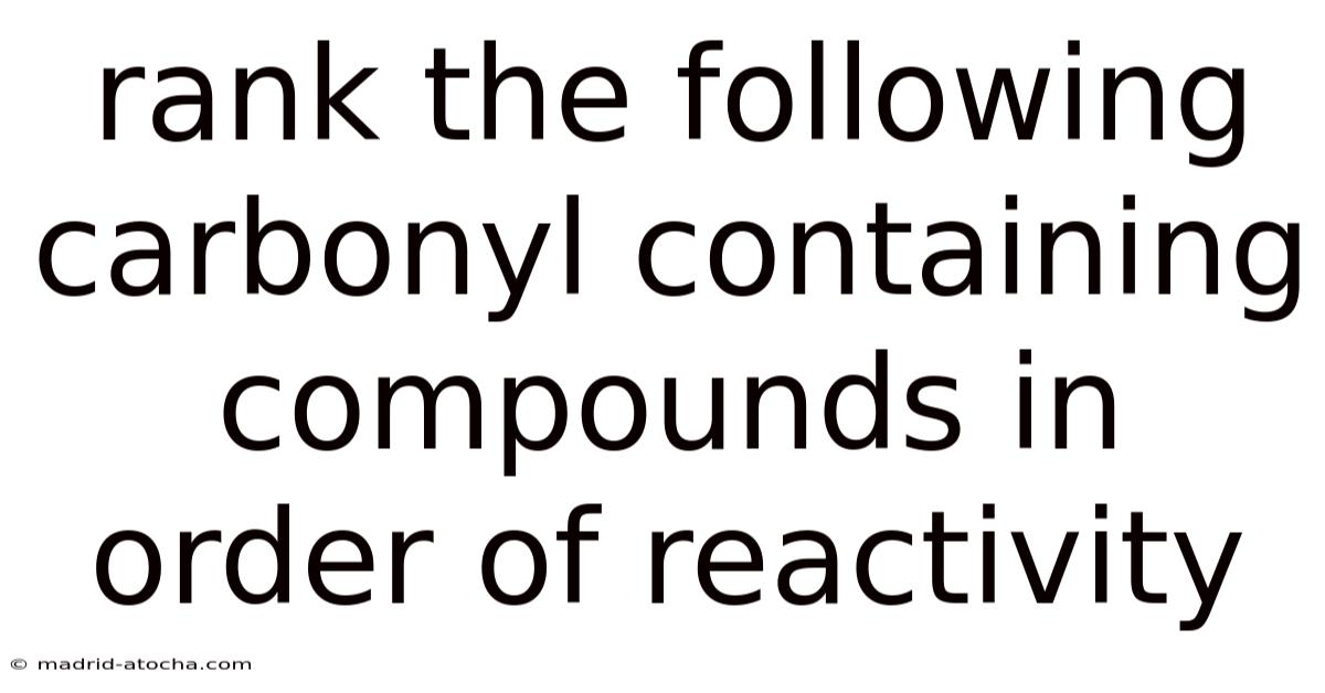 Ranking carbonyl‑containing compounds by reactivity is not a mere memorization exercise; it reflects the interplay of inductive effects, resonance stabilization, steric hindrance, and leaving‑group ability. The consensus order—acid chloride > anhydride > acyl fluoride > ester > aldehyde > ketone > amide—emerges from these fundamental principles and guides chemists in selecting the right substrate for a given transformation Not complicated — just consistent..