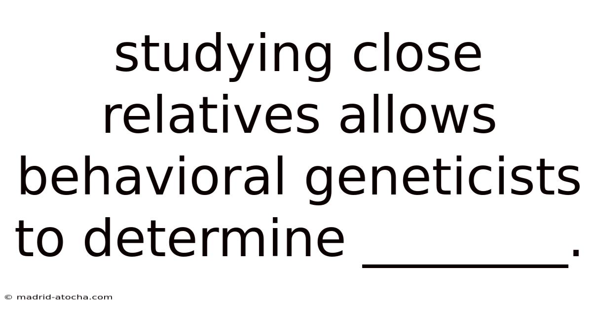 Behavioral genetics is a field that explores the interplay between genetic and environmental factors in shaping human behavior. One of the most powerful tools in this discipline is the study of close relatives. Now, by examining individuals who share varying degrees of genetic similarity—such as twins, siblings, or parent-child pairs—behavioral geneticists can isolate and quantify the extent to which specific behaviors are influenced by heredity. This approach is critical because it helps researchers disentangle the complex web of genetic predispositions and environmental exposures that contribute to traits like intelligence, personality, mental health, and even risk-taking behaviors It's one of those things that adds up..
