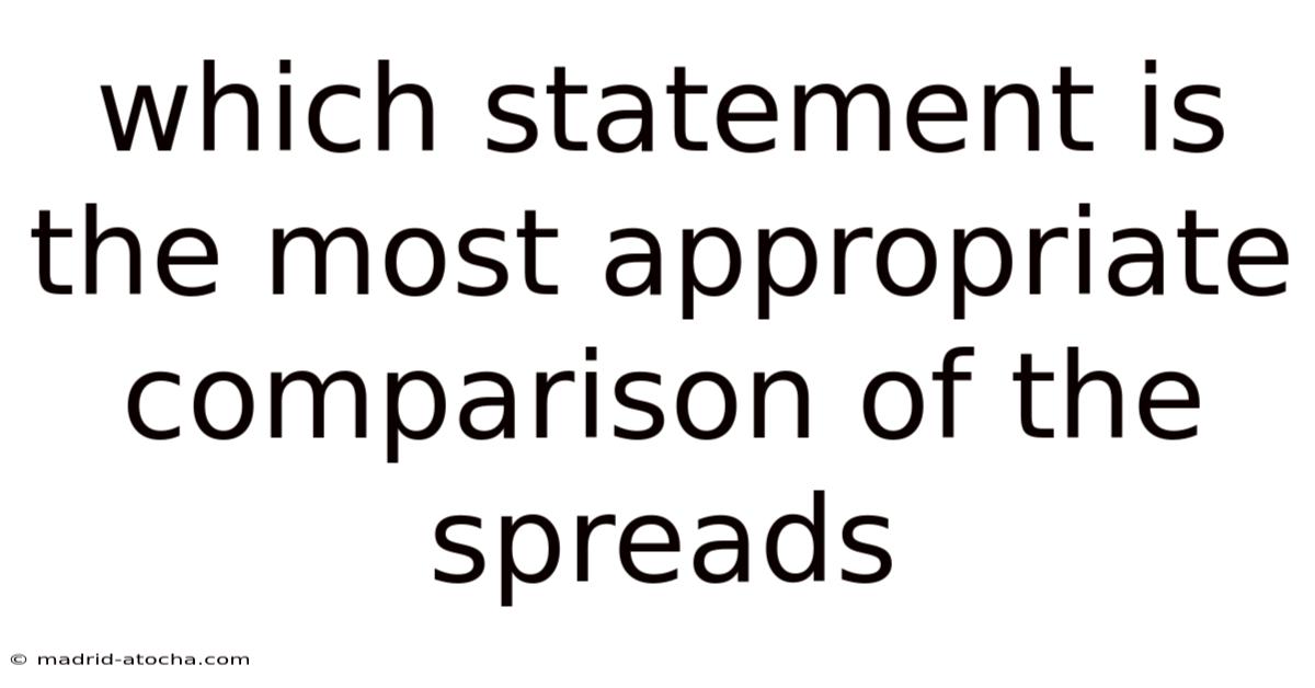 Determining which statement is the most appropriate comparison of the spreads requires a clear understanding of statistical variability, data distribution, and the practical context behind the numbers. But whether you are analyzing academic test scores, financial market returns, or quality control measurements, comparing spreads reveals how consistent, predictable, or volatile a dataset truly is. This guide breaks down the core concepts, evaluates common comparison statements, and provides a structured framework to help you confidently identify the most accurate and meaningful way to measure variability across different datasets Most people skip this — try not to..